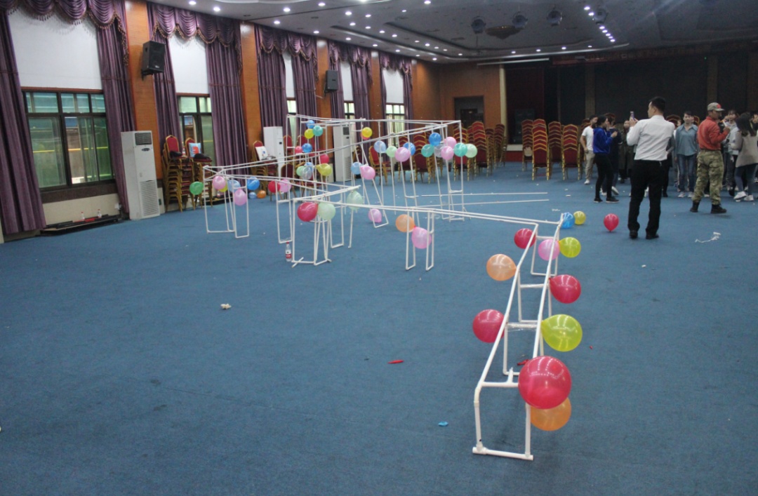 學(xué)員利用PVC管、連接管等模擬鐵道,將各種直的、彎的、高的、低的管子連接,逢山開路遇水搭橋,形成順暢的鐵路運(yùn)輸線,用籃球模擬火車順利運(yùn)行并撞響終點(diǎn)鼓。